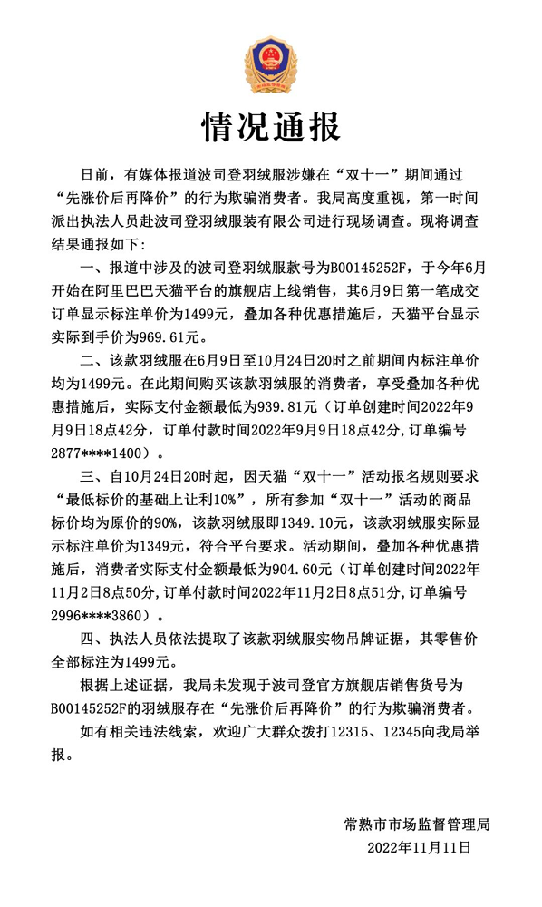 官方通报“波司登羽绒服价格双十一先涨后降”调查结果:未发现欺骗消费者行为