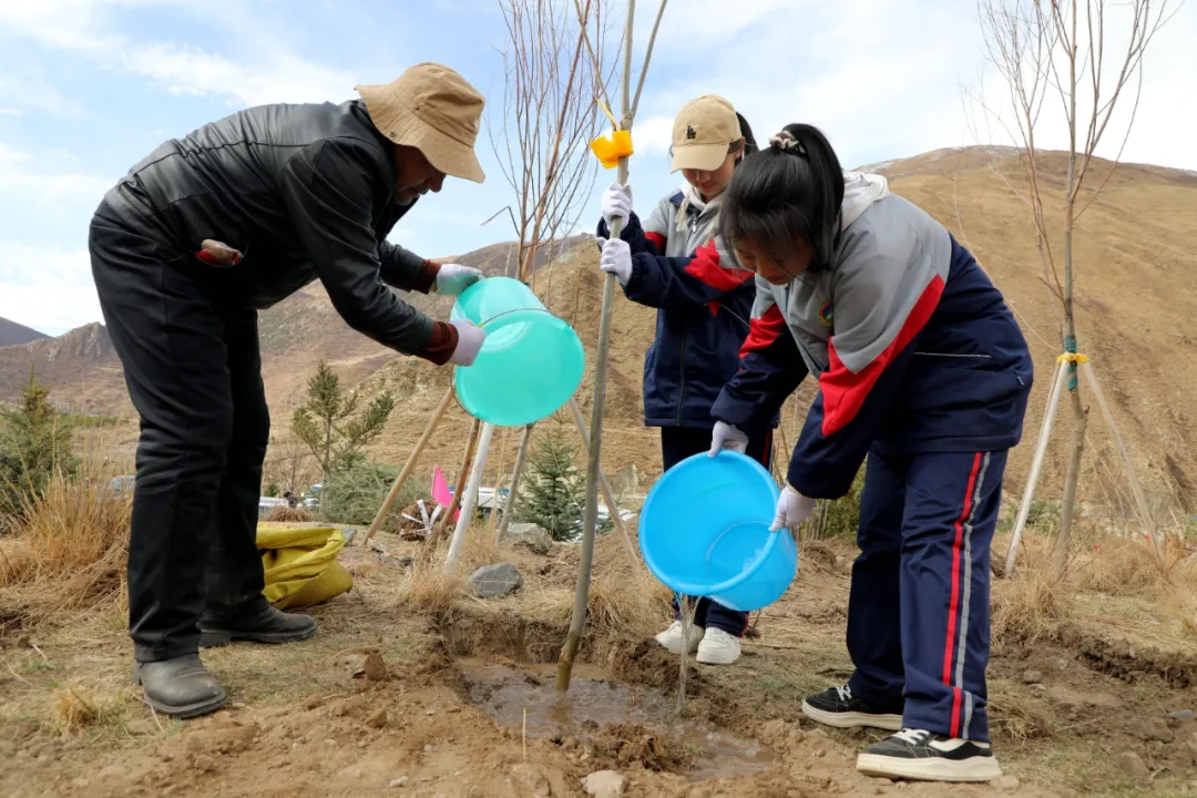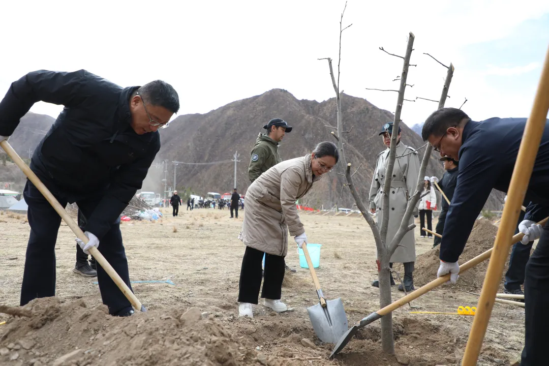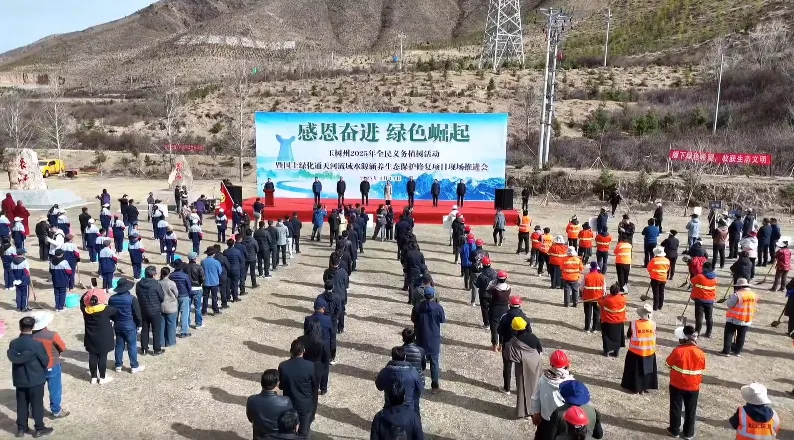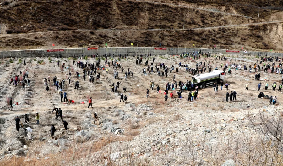 4月14日,玉树州2025年全民义务植树活动暨国土绿化通天河流域水源涵养生态修复项目推进会在称多县歇武镇直门达村造林现场举行。