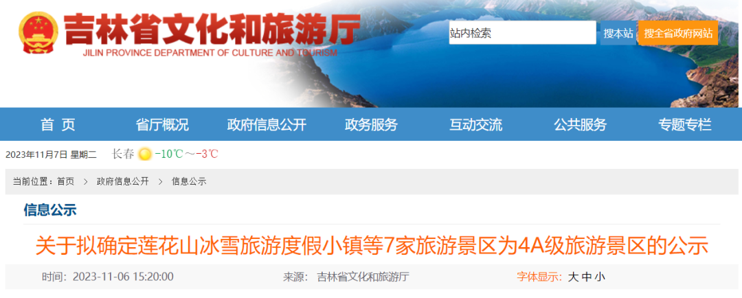 同日,省文旅厅发布《关于拟确定莲花山冰雪旅游度假小镇等7家旅游景区为4A级旅游景区的公示》。