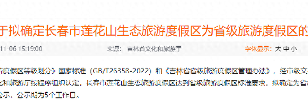 11月6日,省文旅厅发布《关于拟确定长春市莲花山生态旅游度假区为省级旅游度假区的公示》,公示期为5个工作日。