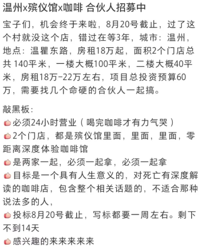 近日,有网友发帖招募合伙人计划在殡仪馆内开咖啡厅引起热议。据网友发布内容,其计划24小时营业,门店位置位于殡仪馆内部,希望咖啡店能具有人生意义、对死亡有深度解读。关于咖啡店具体选址,其计划参与温州市殡仪馆经营场所一招租项目招租竞标。