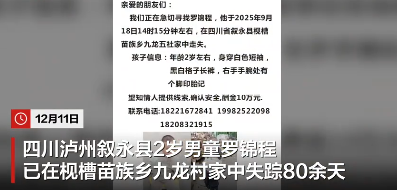 四川叙永县2岁男童在家失踪超80天,当地多方搜寻并立案侦查