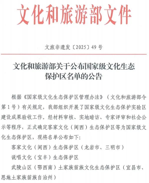 文化和旅游部发布关于公布国家级文化生态保护区名单的公告,藏族文化(玉树)生态保护区入选。