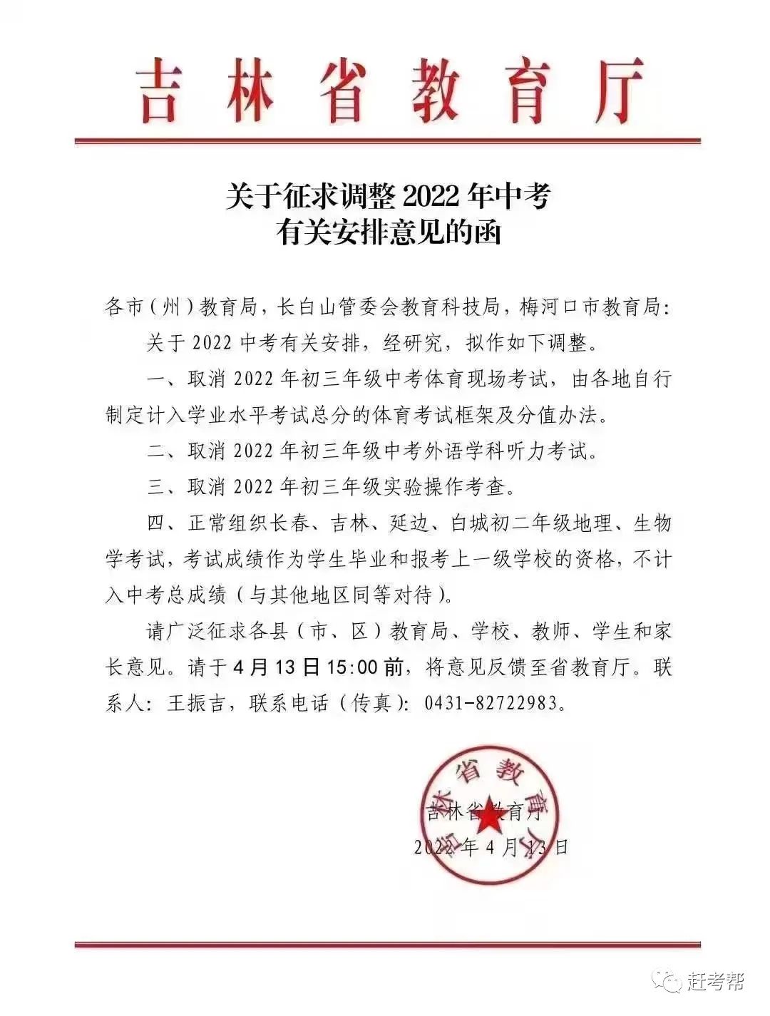 4月13日,吉林省教育厅下发《关于征求调整2022年中考有关安排意见的函》,拟取消中考体育现场考试。
