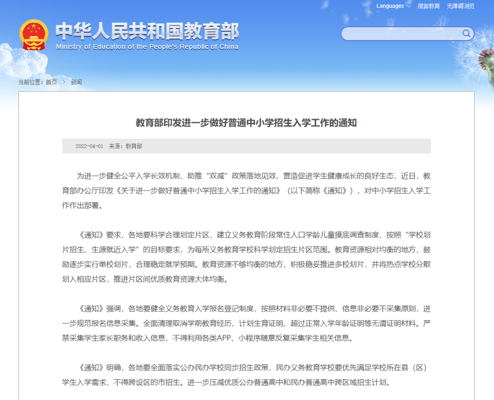 为进一步健全公平入学长效机制,助推“双减”政策落地见效,教育部办公厅印发《关于进一步做好普通中小学招生入学工作的通知》