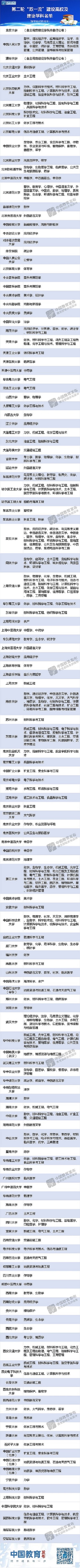 公布的名单共有建设高校147所。建设学科中数学、物理、化学、生物学等基础学科布局59个、工程类学科180个、哲学社会科学学科92个。