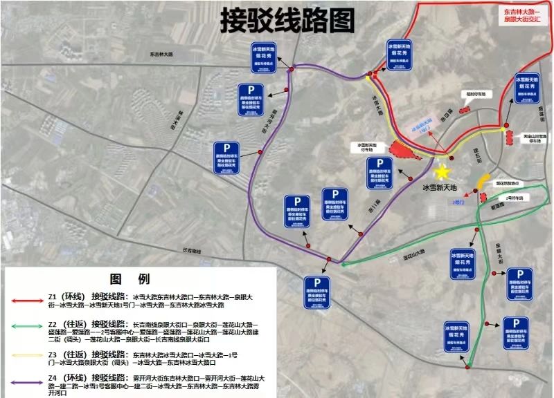 1、冰雪大路东吉林大路口—东吉林大路—泉眼大街—冰雪大路—冰雪新天地1号门—冰雪大路—东吉林大路冰雪大路(8台车)