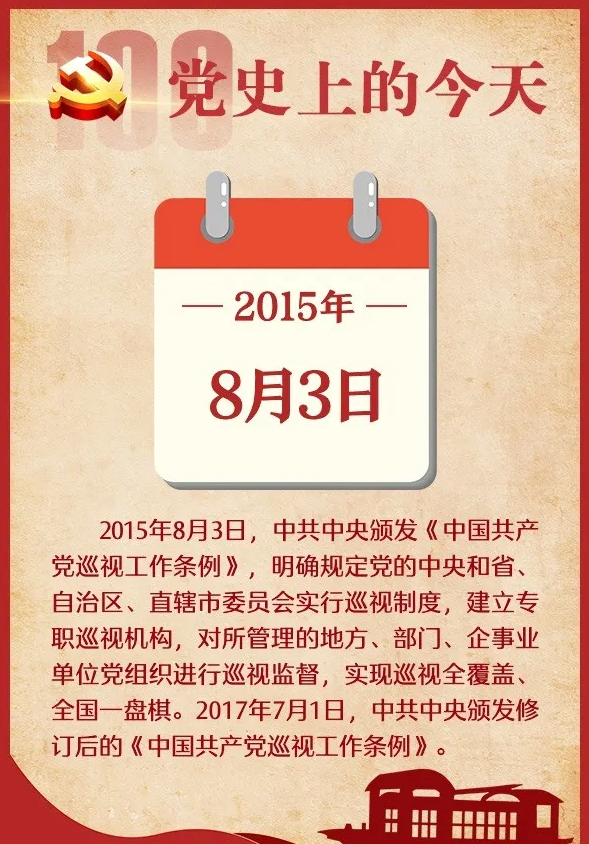 8月3日 中共中央颁发《中国共产党巡视工作条例》,明确规定党的中央和省、自治区、直辖市委员会实行巡视制度,建立专职巡视机构,对所管理的地方、部门、企事业单位党组织进行巡视监督,实现巡视全覆盖、全国一盘棋。2017年7月1日,中共中央颁发修订后的《中国共产党巡视工作条例》。