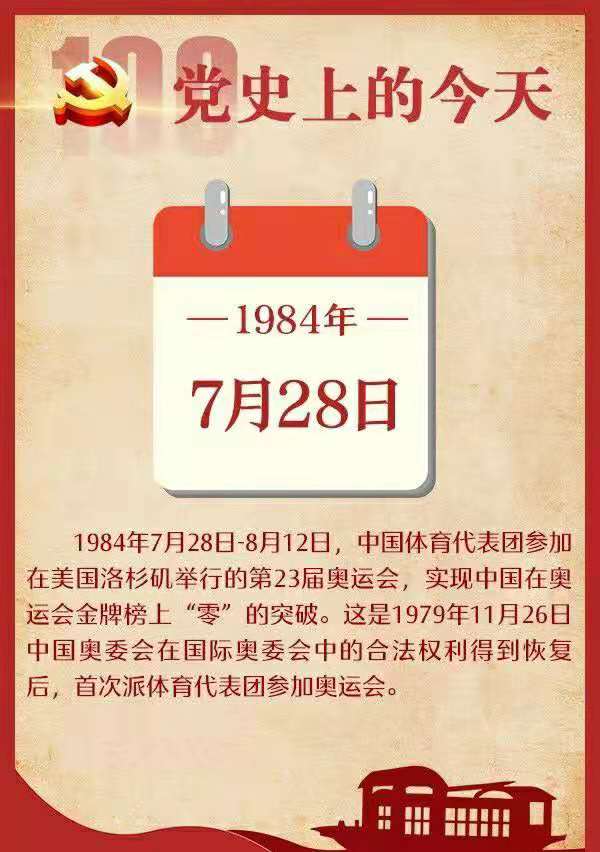 7月28日-8月12日 中国体育代表团参加在美国洛杉矶举行的第23届奥运会,实现中国在奥运会金牌榜上“零”的突破。这是1979年11月26日中国奥委会在国际奥委会中的合法权利得到恢复后,首次派体育代表团参加奥运会。