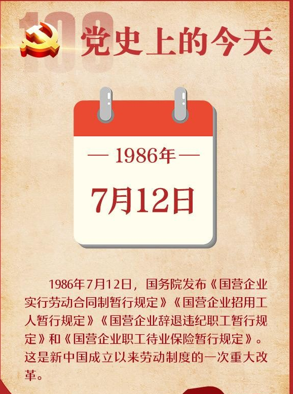 7月12日 国务院发布《国营企业实行劳动合同制暂行规定》《国营企业招用工人暂行规定》《国营企业辞退违纪职工暂行规定》和《国营企业职工待业保险暂行规定》。这是新中国成立以来劳动制度的一次重大改革。