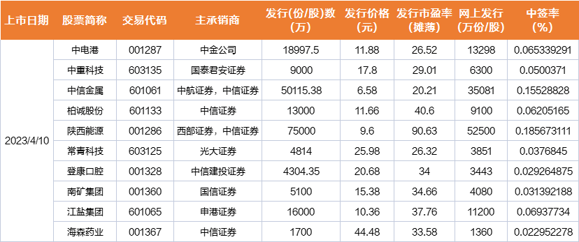 这10只股票分别为:中信金属、中重科技、常青科技、江盐集团、柏诚股份、中电港、海森药业、陕西能源、登康口腔、南矿集团,基本发行信息如下表:
