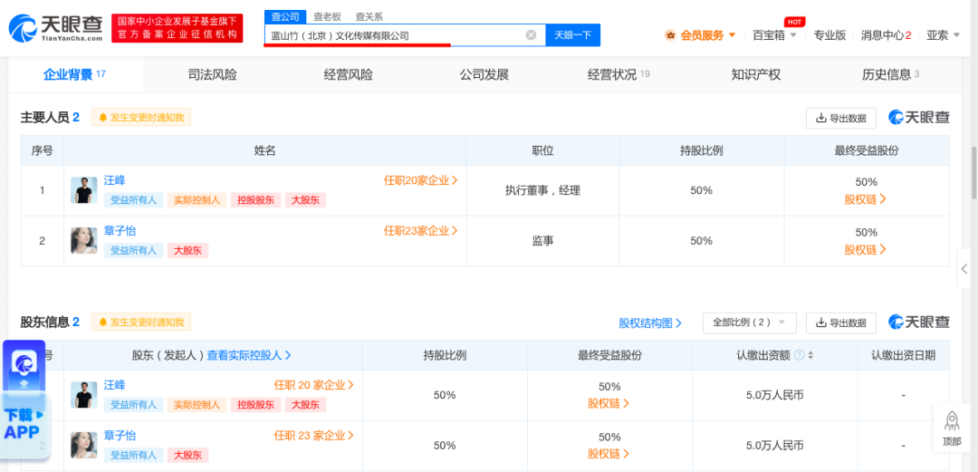 值得一提的是,汪峰和章子怡于2014年成立了蓝山竹(北京)文化传媒有限公司,目前,该公司为存续状态,法定代表人、执行董事、经理为汪峰,监事为章子怡,两人各持股50%。