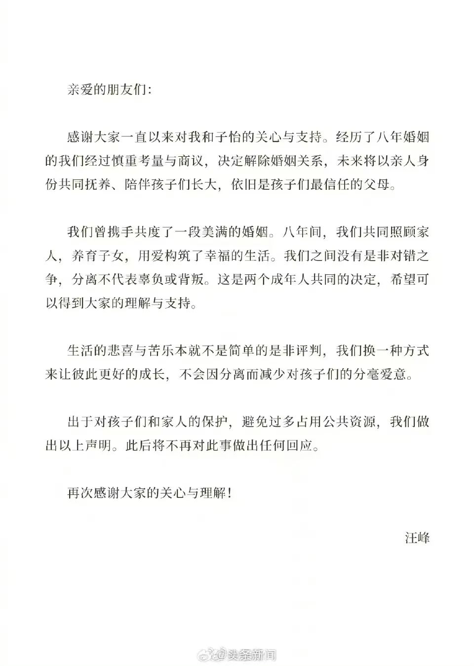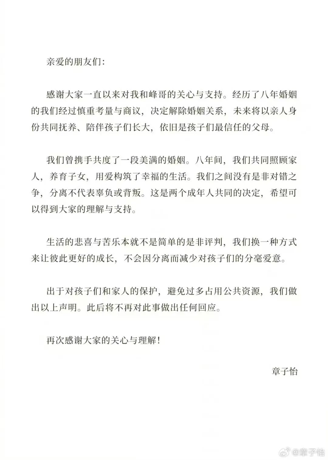 刚刚,汪峰章子怡官宣离婚:决定解除婚姻关系。
