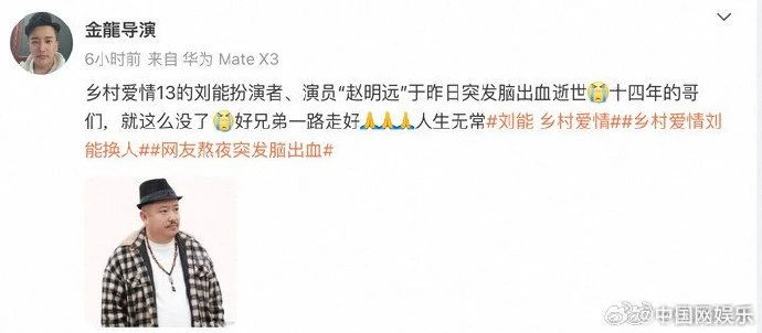乡村爱情官方微博发文悼念,称“我们失去了一位亲爱的家人”: