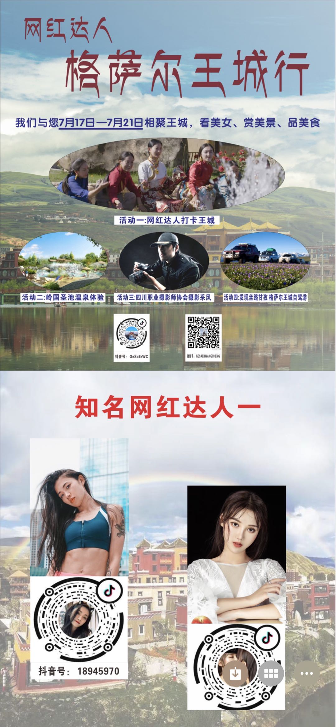 7月17日—21日将举办“网红达人格萨尔王城行”活动。请大家积极组织人员参加并点击图片左下侧下载原图,查看关注内容,通过“抖音短视频”APP扫描关注网红达人,点赞、转发王城宣传视频