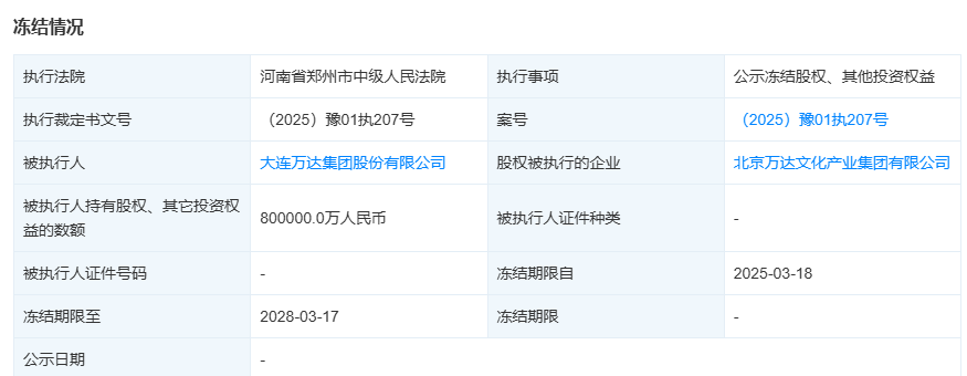 3月20日,据天眼查披露的信息,北京万达文化产业集团有限公司新增1条股权冻结信息,被执行人为公司股东大连万达集团股份有限公司,冻结股权数额80亿元,冻结期限自2025年3月18日至2028年3月17日,执行法院为河南省郑州市中级人民法院。
