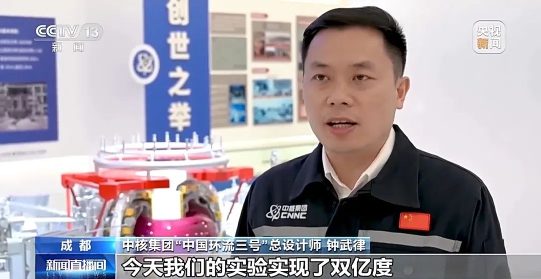中核集团“中国环流三号”总设计师 钟武律:我们的实验实现了“双亿度”,综合参数也大幅跃升,标志着我国的核聚变研究挺进燃烧实验。我们自主研发的加热、控制与诊断等设备与系统首次投入运行,相关技术指标达到了国际前列,创造了我国核聚变研究多项新纪录。