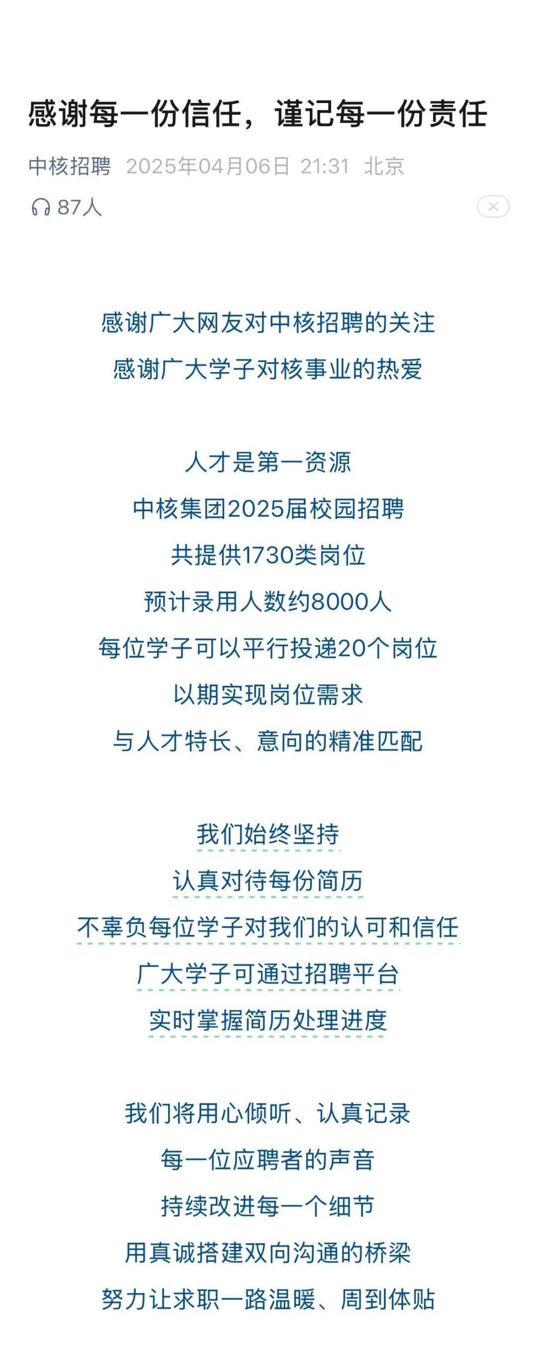 4月6日晚,中核招聘官微发布声明《感谢每一份信任,谨记每一份责任》,回应收到一百多万份简历:感谢广大网友对中核招聘的关注,感谢广大学子对核事业的热爱。人才是第一资源,中核集团2025届校园招聘,共提供1730类岗位,预计录用人数约8000人,每位学子可以平行投递20个岗位,以期实现岗位需求与人才特长、意向的精准匹配。