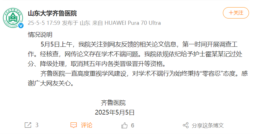 齐鲁医院一直高度重视学风建设,对学术不端行为始终秉持“零容忍”态度。感谢广大网友关心。