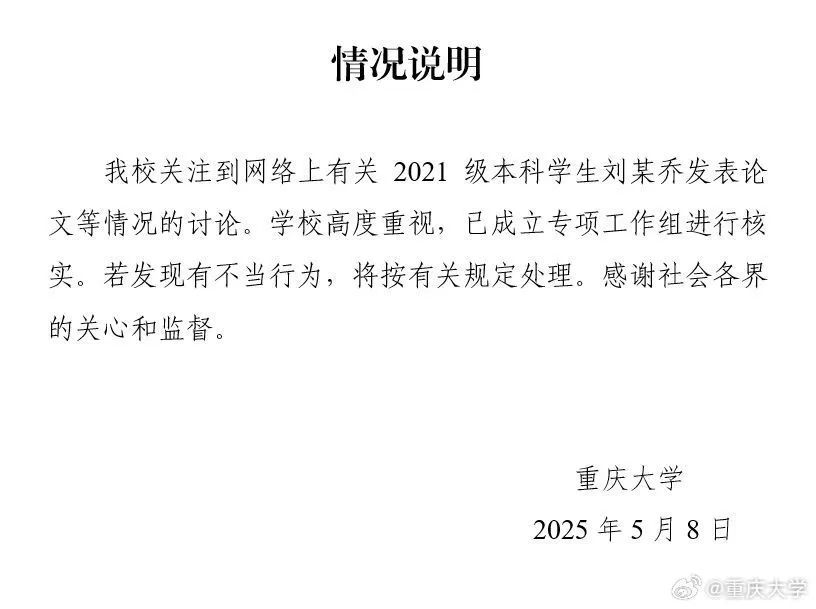 针对重庆大学化学化工学院化学工程与工艺专业2021级学生刘某乔发布论文情况,5月8日晚,重庆大学发布《情况说明》称,该校已成立专项工作组进行核实,若发现有不当行为,将按有关规定处理。