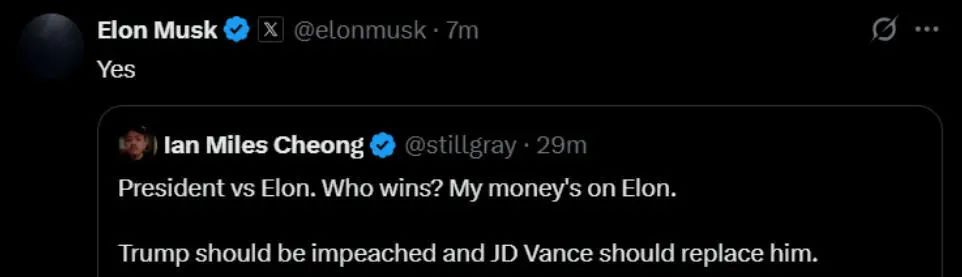 马斯克当天在社交媒体平台“X”上一则有关支持弹劾特朗普的贴文中回复“是的”。
