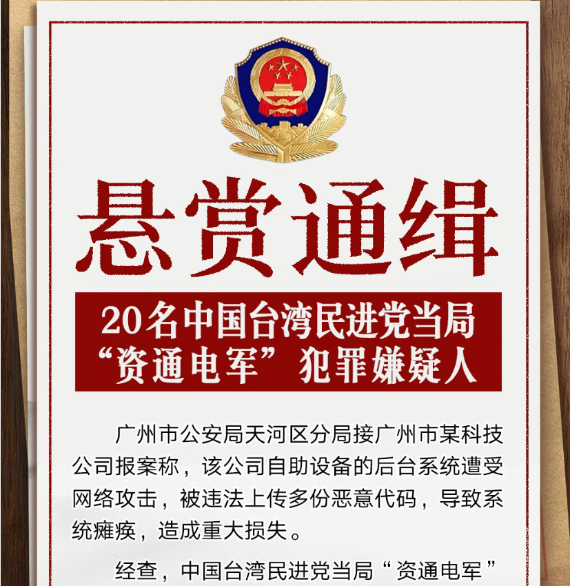 6月5日,广州市公安局天河区分局正式发布《悬赏通告》,向社会详细公布中国台湾民进党当局“资通电军”指挥实施了此次非法网络攻击活动,涉嫌多项违法犯罪,并对宁恩纬等20名参与实施上述网络攻击活动的首要犯罪嫌疑人进行悬赏通缉。
