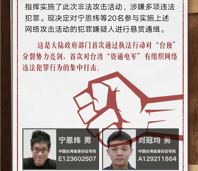 这是大陆政府部门首次通过执法行动对“台独”分裂势力亮剑,首次对台湾“资通电军”有组织网络违法犯罪行为的集中打击,一举查实20名犯罪嫌疑人真实身份,全面固定犯罪证据并公开悬赏通缉。