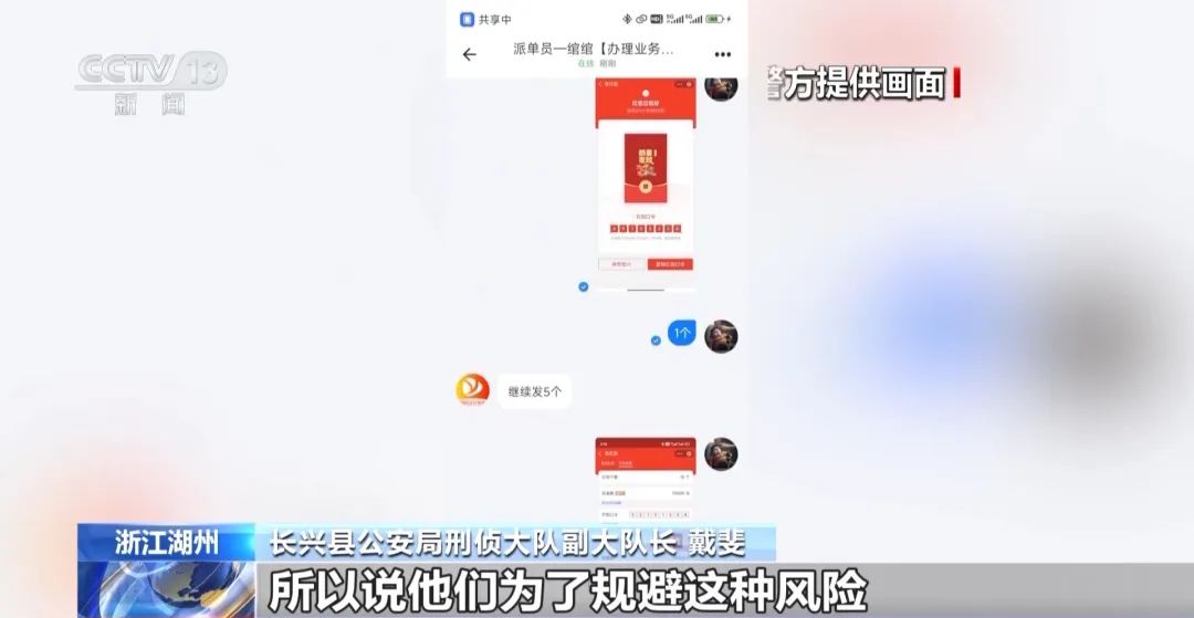长兴县公安局刑侦大队副大队长 戴斐:都是一些小面额的几百块钱的红包,如果他发的金额大的,就容易被发现存在这种风险,所以说他们为了规避这种风险,就搞成小面额的数量多一点,哪怕是被我们公安截获了之后,他的损失也会很小。
