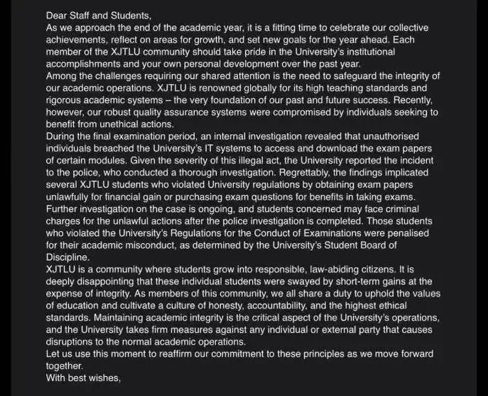 同时,有学生表示收到了疑似关于此公告的邮件通知。“在期末考试期间,一项内部调查显示,未经授权的个人入侵了大学的IT系统,以访问和下载某些模块的试卷。鉴于这一非法行为的严重性,大学向警方报告了这一事件,警方进行了彻底的调查。”