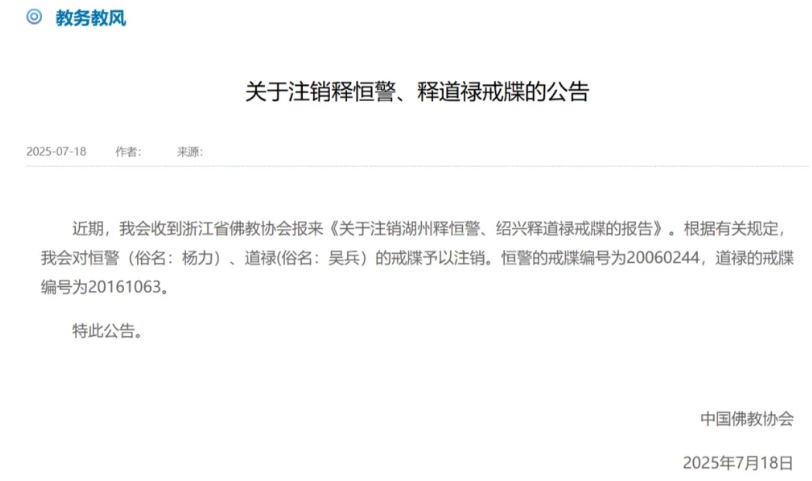 7月18日,中国佛教协会发布公告称,近期,我会收到浙江省佛教协会报来《关于注销湖州释恒警、绍兴释道禄戒牒的报告》。