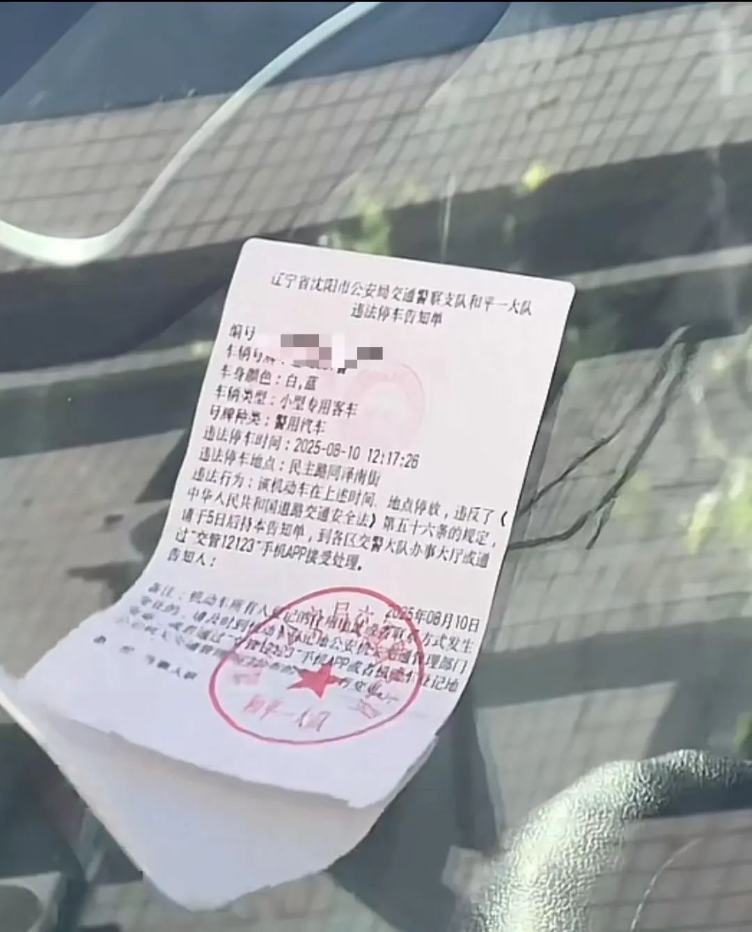 视频中,被贴罚单的两辆车为警车涂装,车身印有警徽与公安字样。车窗上贴有沈阳市公安局交通警察支队和平一大队违法停车告知单,违停时间为8月10日12时17分,违停地点为民主路同泽南街,号牌种类为警用车辆。
