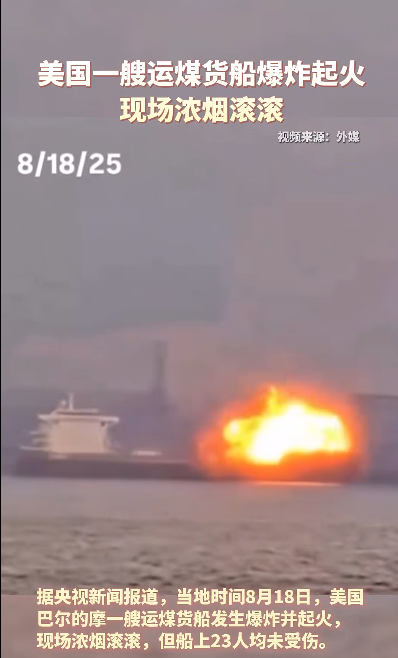 当地时间8月18日,记者获悉,美国巴尔的摩一艘运煤货船发生爆炸并起火,现场浓烟滚滚,但船上23人均未受伤。
