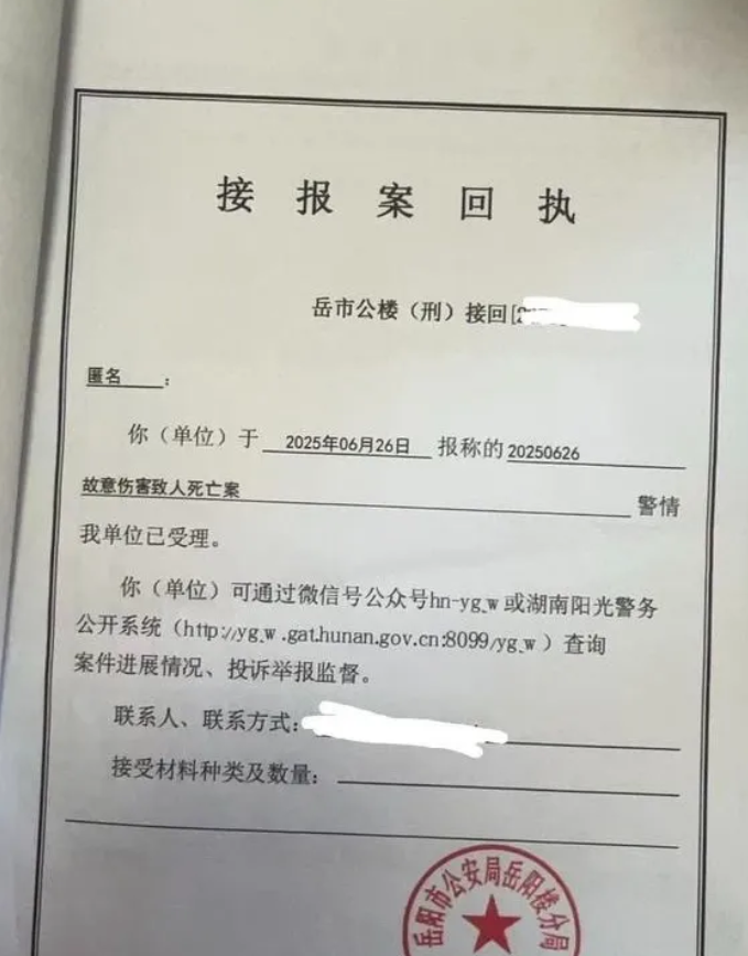 报案回执显示,岳阳市公安局岳阳楼分局刑事警察大队已受理此案。知情人称,目前案件仍在侦查阶段,朱先生还有2个年幼的孩子,其家属希望凶手得到严惩。