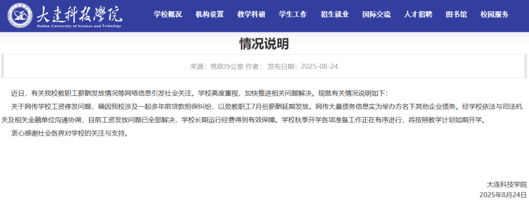 近日,大连科技学院校教职工薪酬发放情况等网络信息引发社会关注。