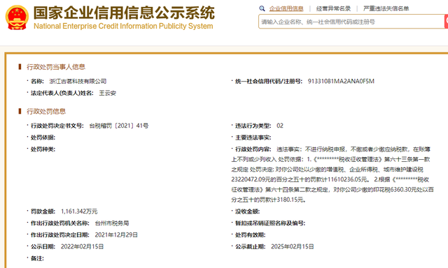 据国家企业信用信息公示系统网站显示,浙江古茗科技有限公司因不进行纳税申报,不缴或者少缴应纳税款,在账簿上不列或少列收入,税务局对该公司处以少缴的增值税、企业所得税、城市维护建设税2322万余元的50%罚款计1161万余元,对该公司少缴的印花税6360.30元处以50%罚款计3180.15元。