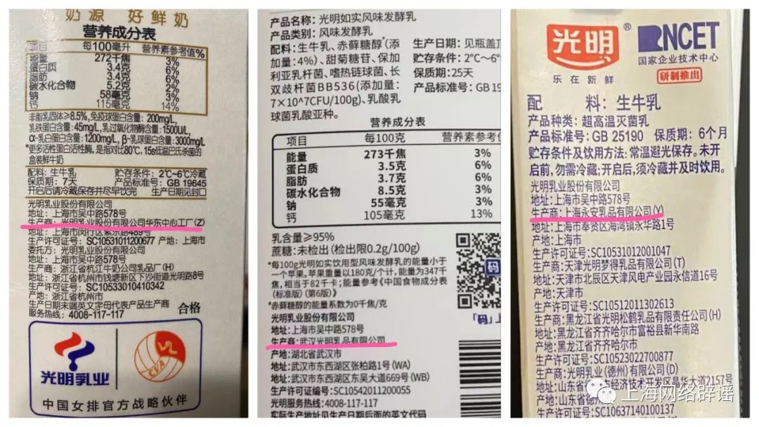 上海辟谣平台还收集了目前市场在售的数款光明乳业产品核查。其中,光明优倍鲜奶、光明致优鲜奶的生产商均显示为位于闵行区紫东路的光明乳业华东中心工厂;光明优加纯牛奶的生产商是上海永安乳品有限公司等;光明如实风味发酵乳的生产商有武汉市的武汉光明乳品有限公司等。