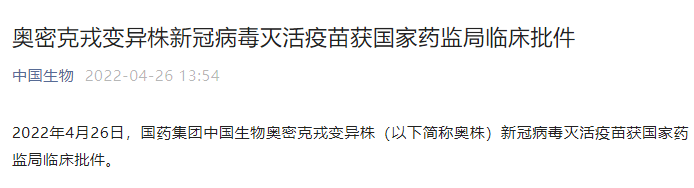 2022年4月26日,国药集团中国生物奥密克戎变异株(以下简称奥株)新冠病毒灭活疫苗获国家药监局临床批件。