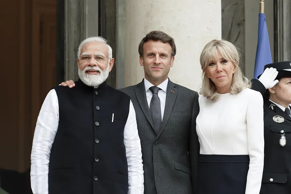 当地时间2022年5月4日,法国巴黎,法国总统马克龙(中)偕妻子布丽吉特在爱丽舍宫会见印度总理莫迪。
