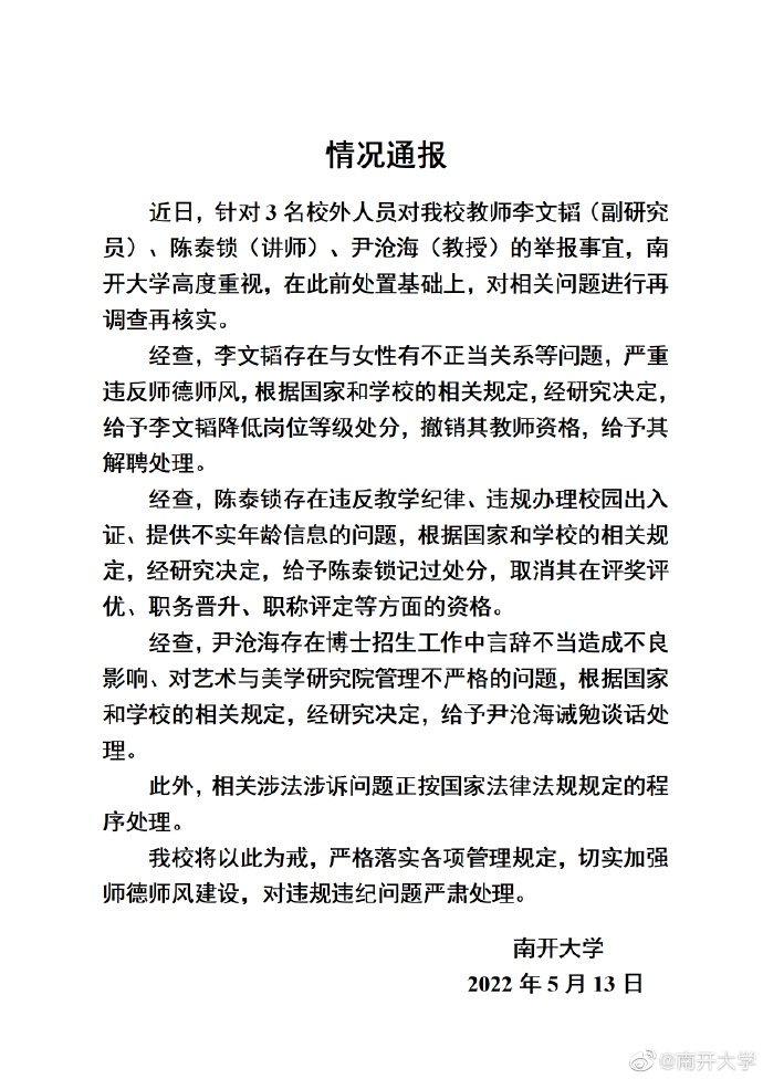 南开大学通报3名教师被举报:存在与女性有不正当关系等问题