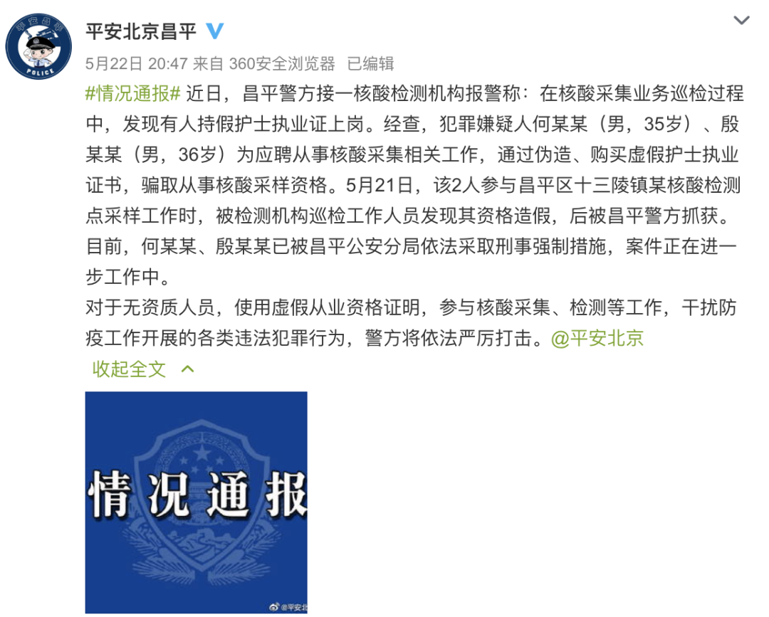 北京2人伪造护士证参与核酸采样工作,被警方抓获