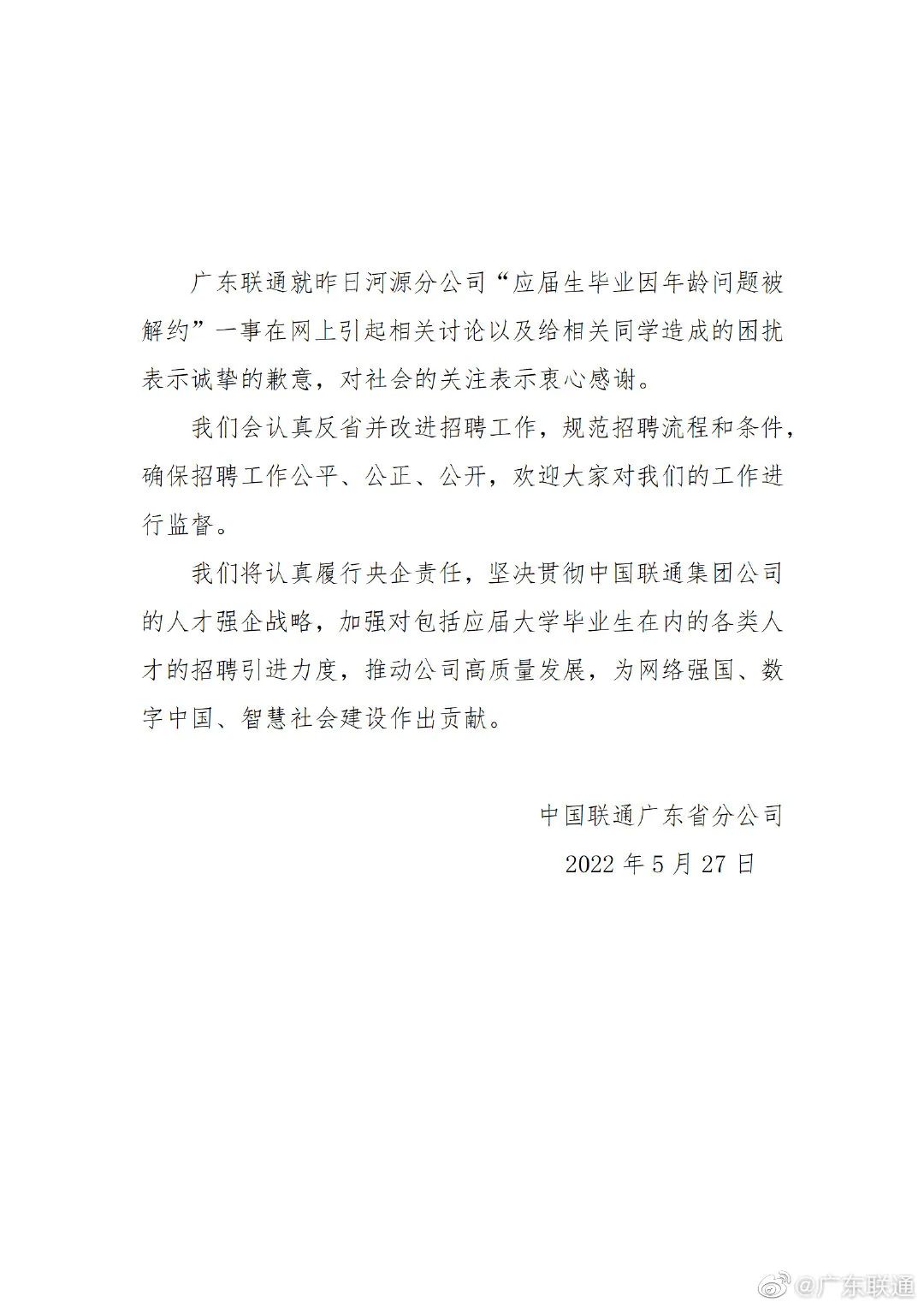 5月27日,广东联通就河源分公司“应届生毕业因年龄问题被解约”一事致歉。声明全文如下: