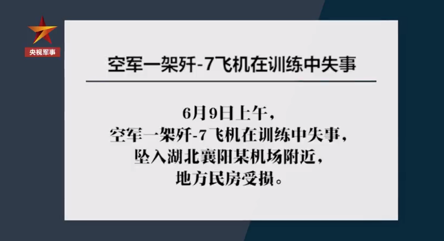 6月9日上午,空军一架歼-7飞机在训练中失事,坠入湖北襄阳某机场附近,造成地方民房受损。