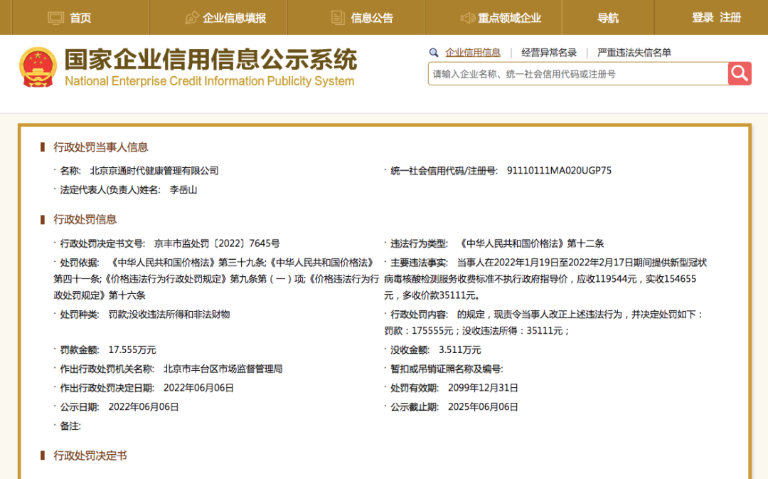 其中,北京京通时代健康管理有限公司在2022年1月19日至2022年2月17日期间提供新型冠状病毒核酸检测服务收费标准不执行政府指导价,应收119544元,实收154655元,多收价款35111元。因违反《中华人民共和国价格法》第三十九条;《中华人民共和国价格法》第四十一条;《价格违法行为行政处罚规定》第九条第(一)项;《价格违法行为行政处罚规定》第十六条规定,丰台区市场监督管理局责令当事人改正上述违法行为,并处罚款175555元,没收违法所得35111元。