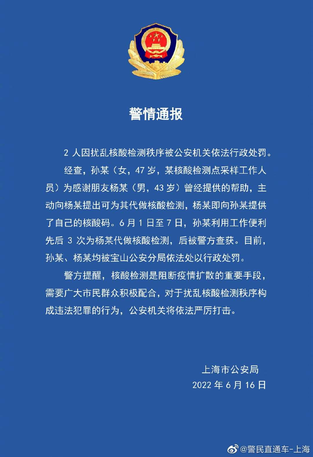 6月16日,记者从上海市公安局获悉,2人因扰乱核酸检测秩序被公安机关依法行政处罚。