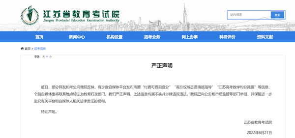 江苏省教育考试院严正声明,上述信息均属不实并涉嫌违规违法,江苏省教育考试院已向公安和市场监管等部门举报,并保留进一步追究有关平台和自媒体人相关法律责任的权利。