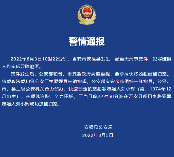 8月3日安福县一幼儿园重大刑事案件嫌疑人刘小辉在吉安市万安县被抓获。