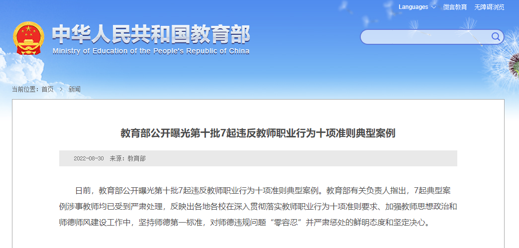 日前,教育部公开曝光第十批7起违反教师职业行为十项准则典型案例。