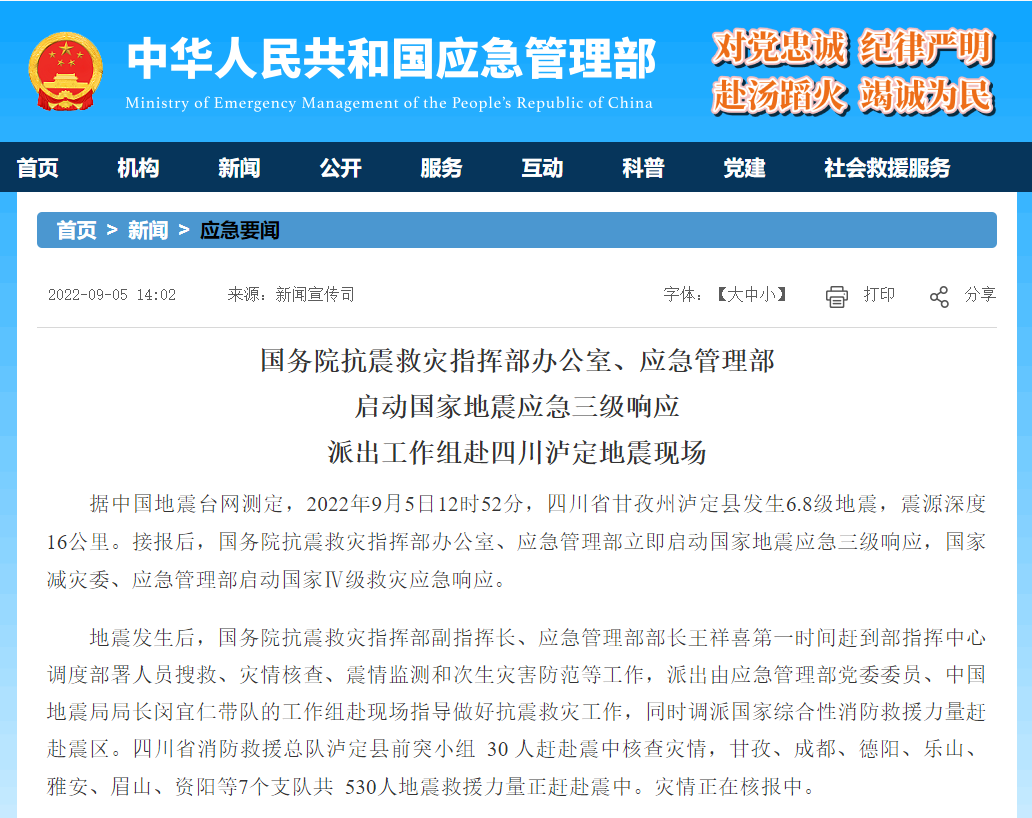 据中国地震台网测定,2022年9月5日12时52分,四川省甘孜州泸定县发生6.8级地震,震源深度16公里。接报后,国务院抗震救灾指挥部办公室、应急管理部立即启动国家地震应急三级响应,国家减灾委、应急管理部启动国家Ⅳ级救灾应急响应。