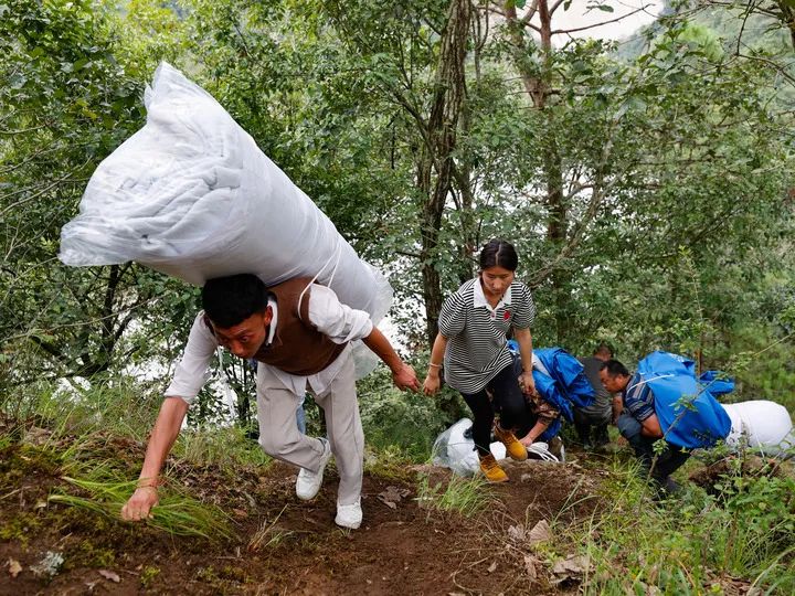 9月8日,在四川省甘孜州泸定县磨西镇附近,救援人员沿着临时开辟的上山小路运送救灾帐篷等物资。新华社记者 沈伯韩 摄