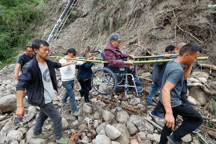 9月8日,在四川省甘孜州泸定县磨西镇附近,人们将一位从磨子沟村疏散出来的受伤人员抬出。新华社记者 沈伯韩 摄